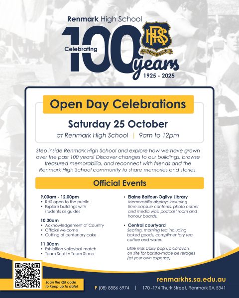 Saturday 25 October: Open Day Celebrations at Renmark High School from 9am – 12pm.